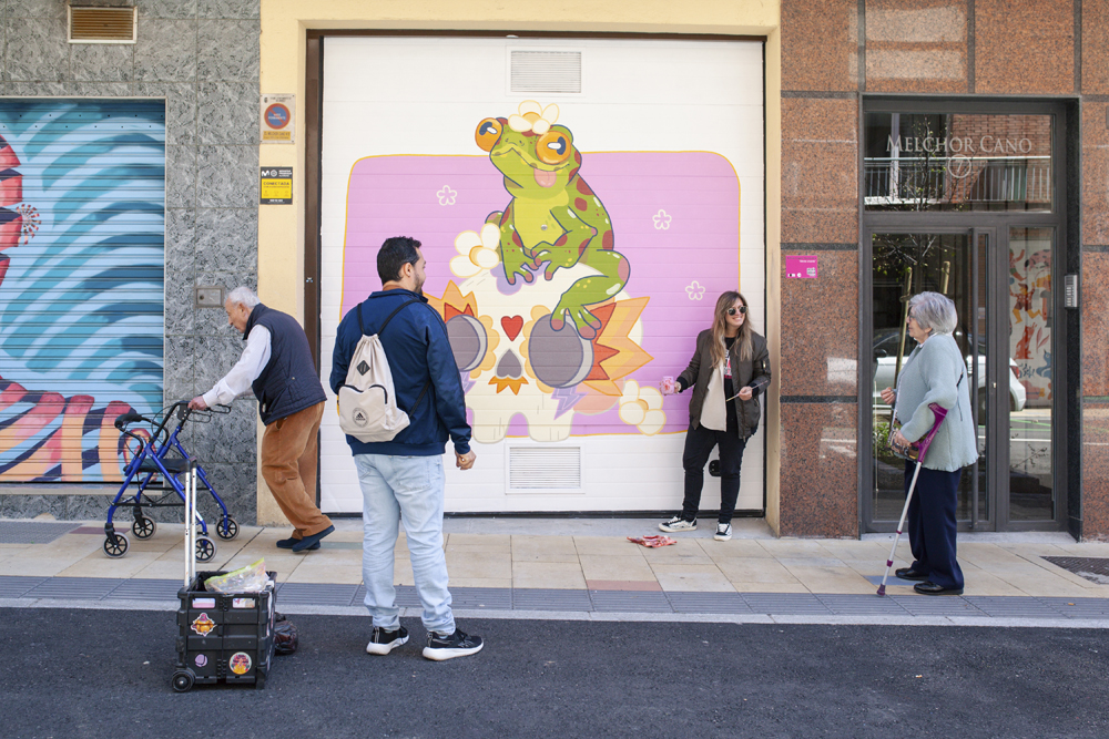 Ortiz captó un momento muy especial, una de las artistas, Silvia López, hablando con una vecina y contándole el mural que estaba pintando. Además, resultó que fue la obra ganadora, en la calle Melchor Cano 7: Mente Croante.