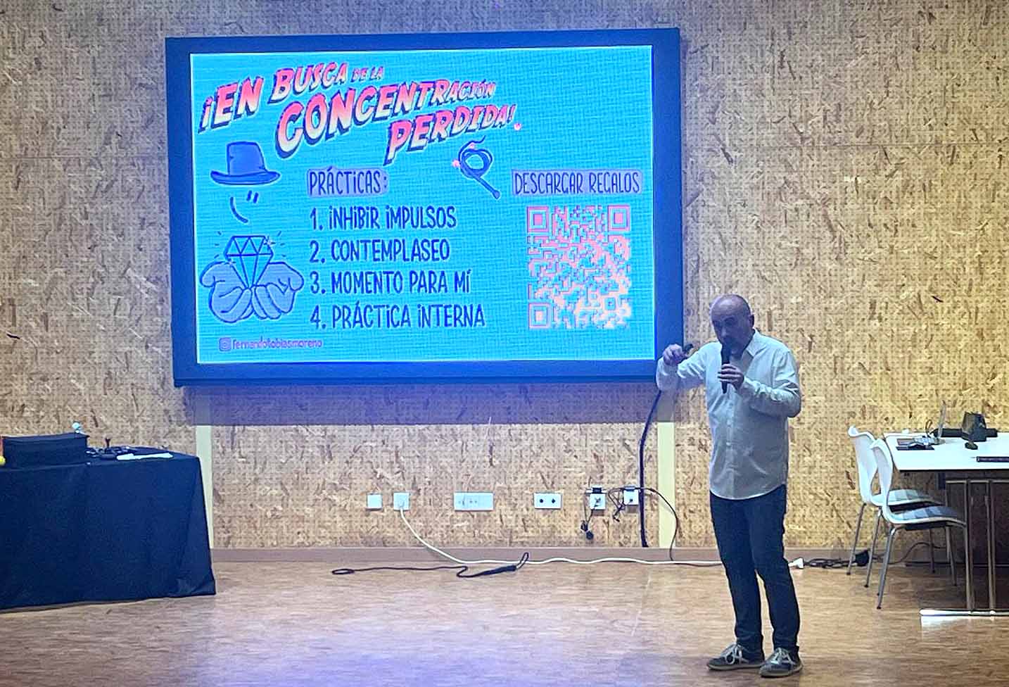 Ante un público lleno de docentes con ganas de entender mejor a sus alumnos, Tobías ofreció una experiencia interactiva que combinó humor, juegos, ejercicios de atención y reflexión personal. La sesión puso el foco en un problema cada vez más extendido, la pérdida de capacidad de concentración en un entorno marcado por la hiperconectividad y la sobreestimulación sobre todo de manera digital.