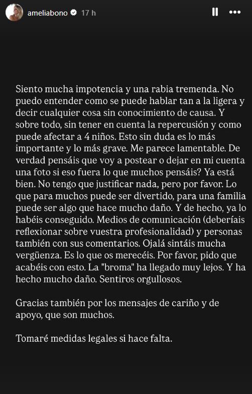 Amelia Bono da las gracias por los mensajes de cariño y apoyo que ha recibido, «que son muchos».