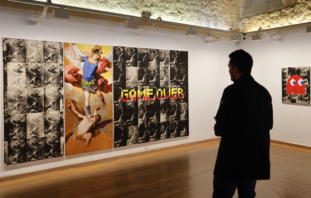 El artista plástico y antiguo alumno de la Universidad de Salamanca, presenta 72 imágenes que, tal y como avanzó la vicerrectora de Cultura, Matilde Olarte, “se asocian a obras de Ribera, Velázquez, El Greco, Rubens, Luca Giordano o William Bouguereau y se relacionan con citas irónicas al imaginario pop o la cultura de los videojuegos”.