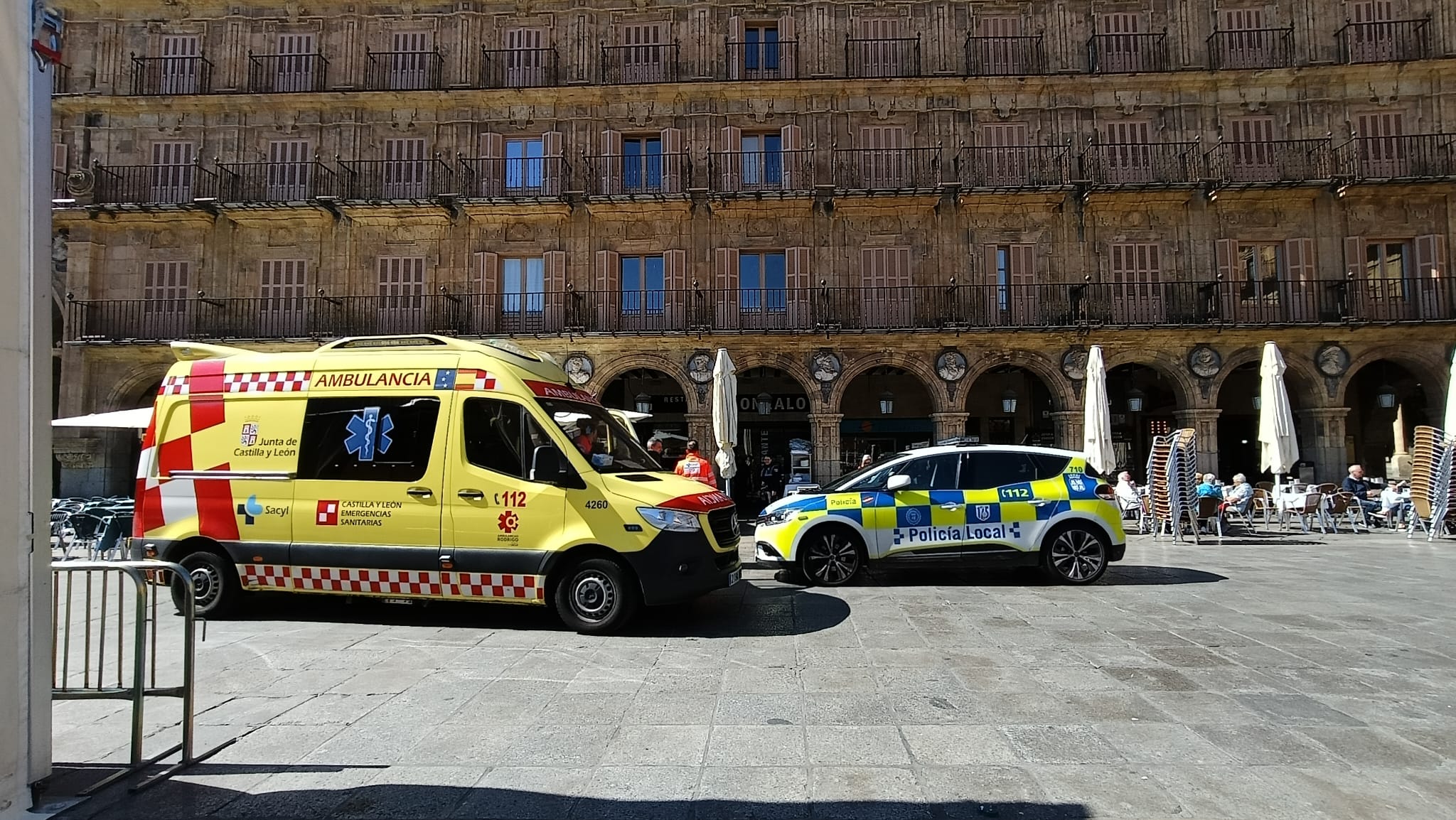 Hasta la Plaza Mayor también se acercó una ambulancia de soporte vital básico, con personal médico que atendió al herido y lo trasladaron hasta el hospital de salamanca.