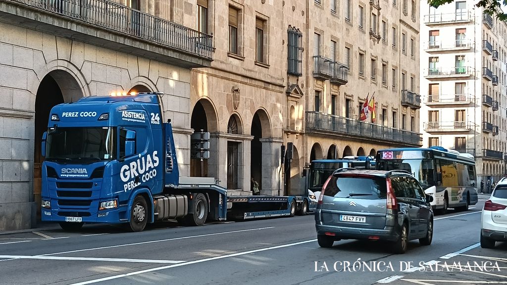 No todos los días se ve cómo la grúa remolca un vehículo de semejantes dimensiones desde una calle del casco urbano.