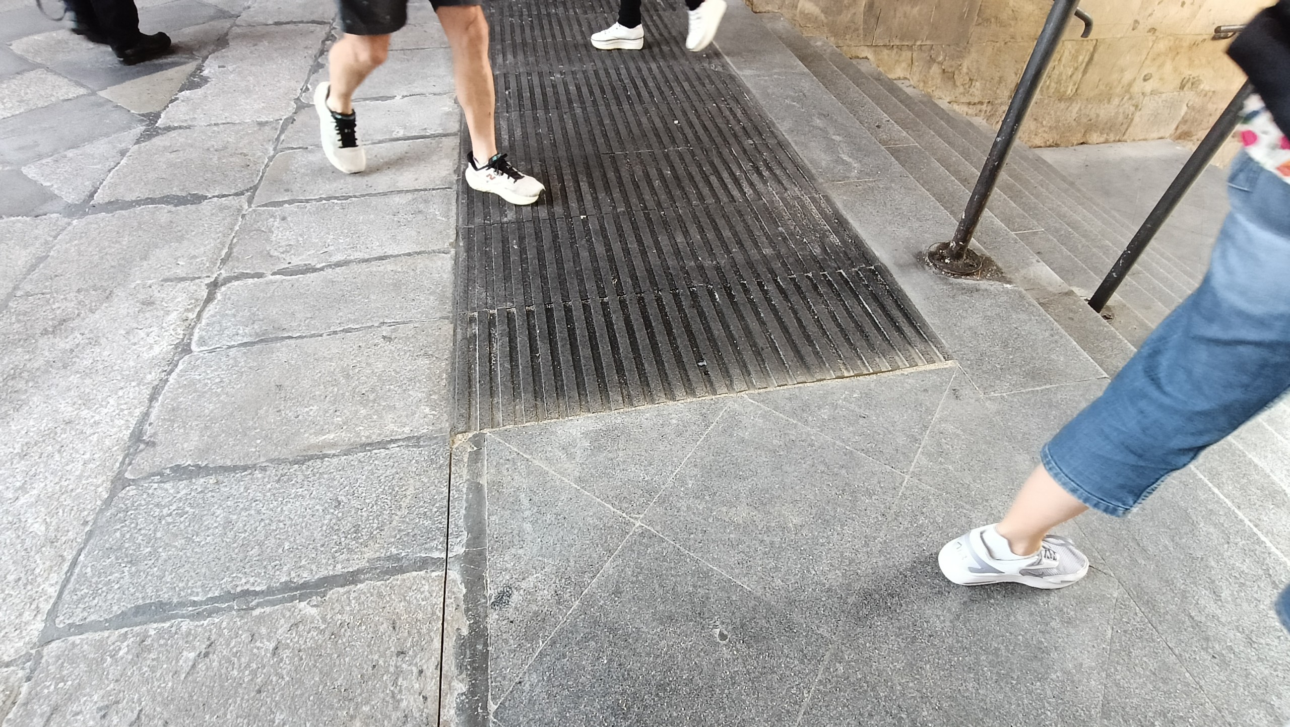 Los caminantes secan las suelas de los zapatos, cual felpudo, para impedir que al bajar o subir los peldaños puedan sufrir un percance resbalándose por las escaleras que dan acceso o salida a la Plaza Mayor camino del Mercado Central.