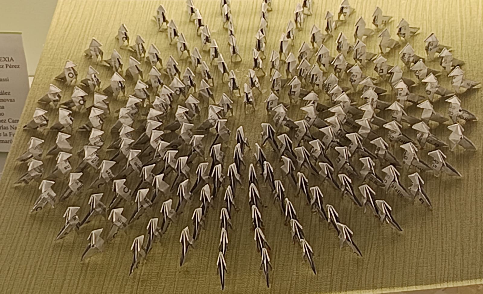 Esta pequeña, pero interesante exposición ofrece al visitante más de un centenar de variantes a partir del avechuche unamuniano. La técnica empleada es realmente curiosa ya que, excepto tres, todas las figuras se han plegado con una sola hoja de papel, sin cortes ni adhesivos, formando grupos de familias de diferentes ámbitos de la sociedad.