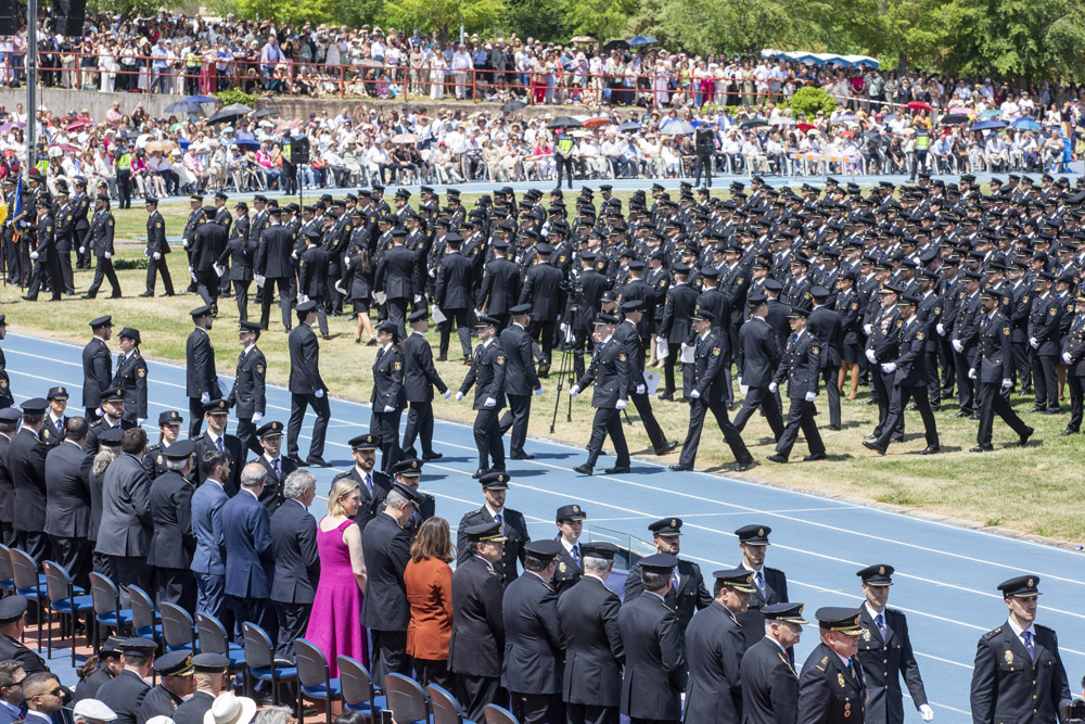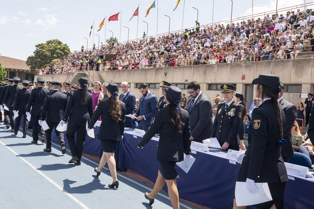 El acto de jura, con el tradicional desfile de los nuevos policías para recoger sus títulos de manos de las autoridades, y los discursos dieron paso al homenaje a los agentes que dieron su vida por España, entre ellos el policía alumno de esta promoción Ángel Luis Menchero, tras el cual llegó el momento para la fiesta, con el clásico lanzamiento de las gorras y los abrazos entre compañeros y con sus familiares. Aunque las celebraciones continuarán durante todo el día en distintos puntos de la ciudad.