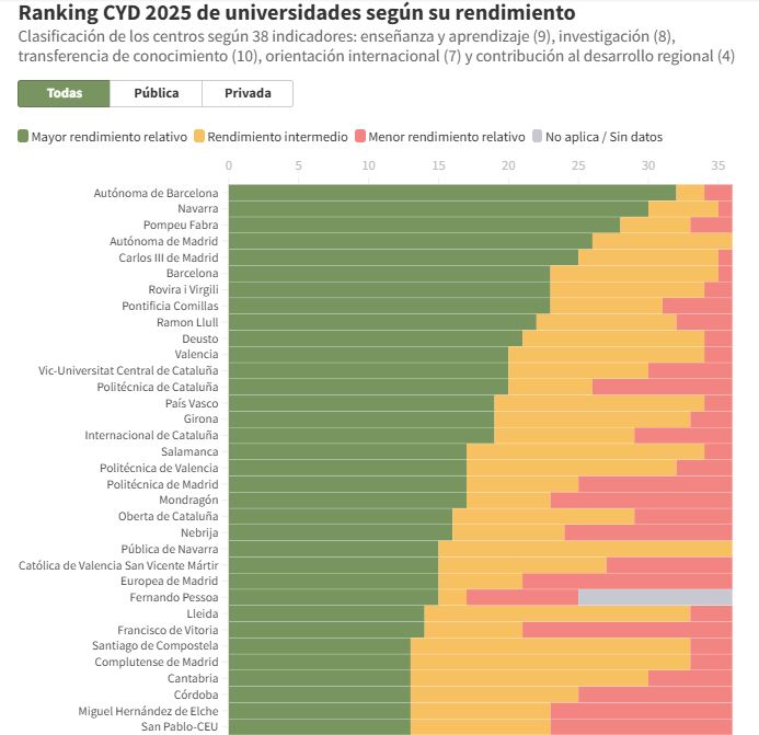 Las 10 universidades españolas que destacan en el ranking elaborado por la Fundación Conocimiento y Desarrollo por tener un número más elevado de indicadores pertenecientes al grupo de mayor rendimiento son: Autònoma de Barcelona, Navarra, Pompeu Fabra, Autónoma de Madrid, Carlos III de Madrid, Barcelona, Rovira i Virgili, Pontificia Comillas, Ramon Llull y Deusto. La Universidad ocupa el puesto 17 del ranking nacional, con las instituciones del montón, lejos de la élite universitaria española, ya que solo destaca en Biología.