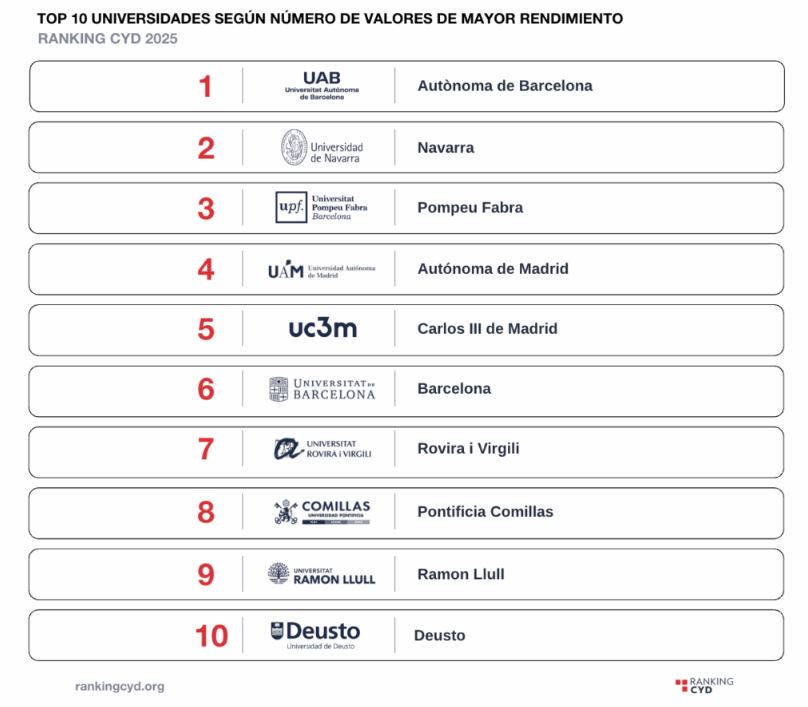 La Fundación CYD ha publicado los resultados de la duodécima edición del Ranking CYD, el ranking con la información más completa y la participación del mayor número de universidades españolas, disponible en www.rankingcyd.org. Los usuarios pueden informarse, conocer y comparar el rendimiento de las universidades según dimensiones como enseñanza y aprendizaje, investigación, transferencia de conocimiento, internacionalización, contribución al desarrollo regional e inserción laboral. Además, el Ranking CYD permite analizar las universidades en su conjunto o bien por los ámbitos de conocimiento de las diferentes titulaciones ofertadas.