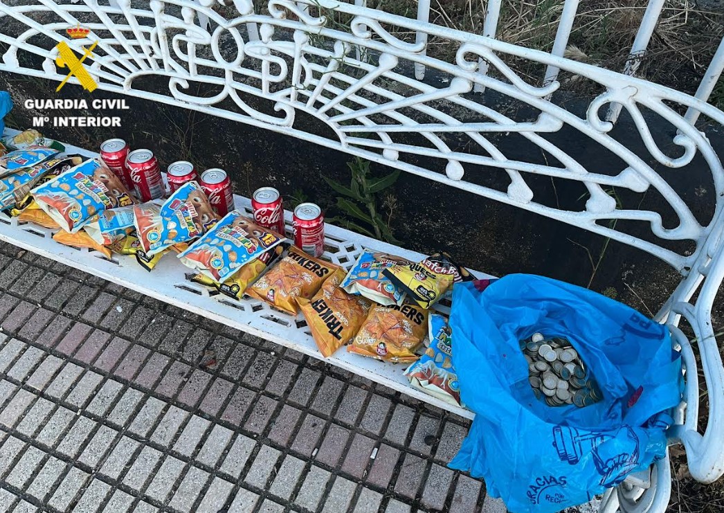 Pocos minutos después se detectó al sospechoso en la rotonda del Helmántico, que llevaba dos bolsas de plástico con latas de bebidas frías, bolsas de snacks y numerosas monedas de un euro, todo ello susceptible de provenir de un segundo hecho delictivo, al no existir dichos efectos en el establecimiento originario del inicio del operativo.