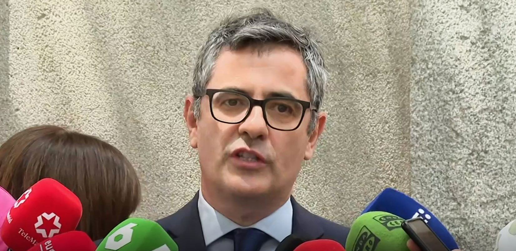 El supuesto delito contra el empresario Alberto González Amador, pareja de la presidenta madrileña, Isabel Díaz Ayuso, se recoge en un auto que aún no es firme, como ha recordado Bolaños, quien ratifica la confianza no sólo en el acusado, sino “en la Fiscalía en su conjunto”