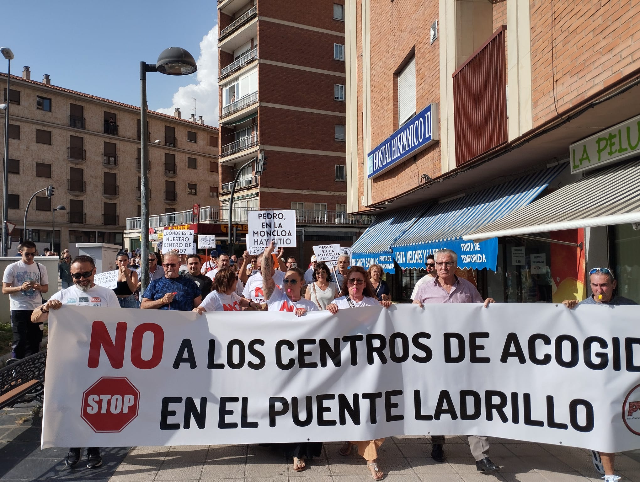Portaban una pancarta donde se podía leer: ‘No a los centro de acogida en El Puente Ladrillo’. Los manifestantes llevaban carteles con las consignas: “Pedro, en la Moncloa hay sitio’, ‘Lo llaman planificación, pero es imposición’ y ‘¿Dónde está nuestro centro de salud?’.