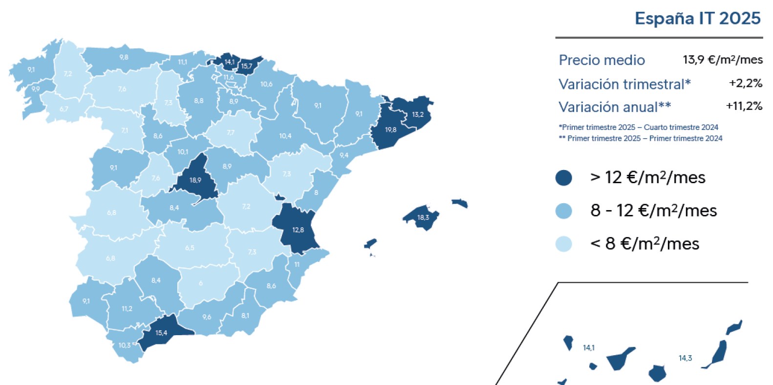 En este primer trimestre, el precio medio del alquiler en España se situó en 13,9 €/m2 mensuales, con un incremento del 2,2% respecto al trimestre anterior y del 11,2% en comparación interanual, según los datos de Solvia. La previsión es que el ejercicio cierre con un incremento interanual de más del 10%.