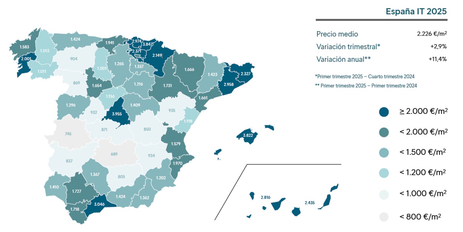 En total la comunidad los precios situaron por debajo de la media nacional de 2.226 €/m², resultante de un crecimiento del 2,9% respecto al trimestre anterior y del 11,4% en comparación con el mismo periodo de 2024, según informa Solvia.