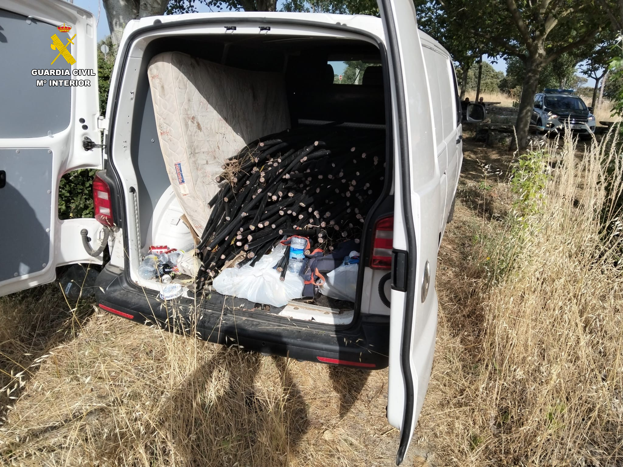 Ante la sospecha de que se encontraran escondidos en dicho lugar para escabullirse de la vigilancia policial tras cometer un hecho delictivo, se procedió a revisar el vehículo, descubriendo en su interior una gran cantidad de cableado de cobre, previsiblemente de líneas aéreas de telecomunicaciones.