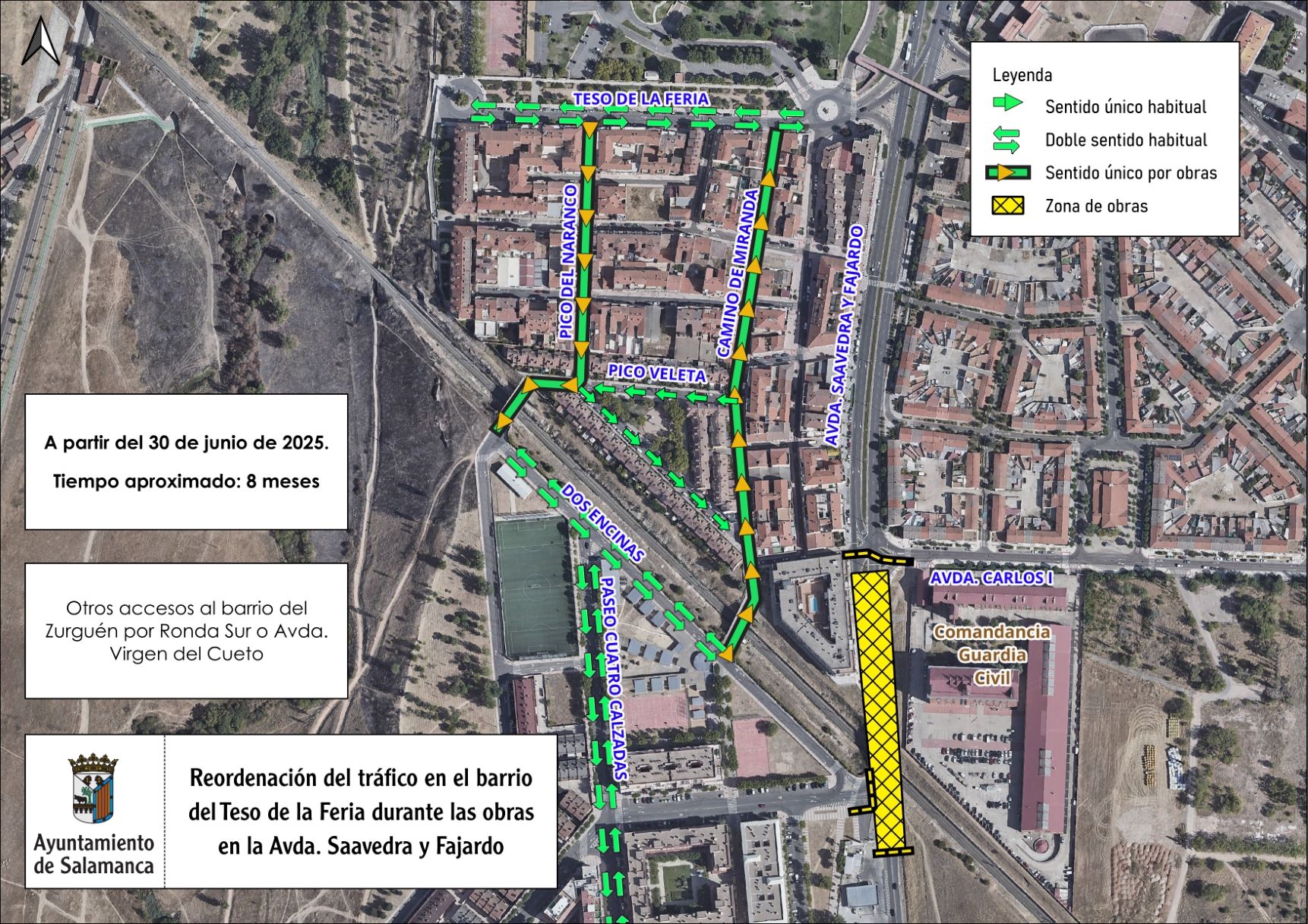 Por una parte, la entrada a la ciudad para los vecinos de los barrios de El Zurguén y Teso de la Feria se realizará por el paseo Cuatro Calzadas, calle Dos Encinas, Camino de Miranda y calle Teso de la Feria. La salida de ciudad se realizará a través de las calles Teso de la Feria, Pico del Naranco, Dos Encinas y paseo de Cuatro Calzadas.
