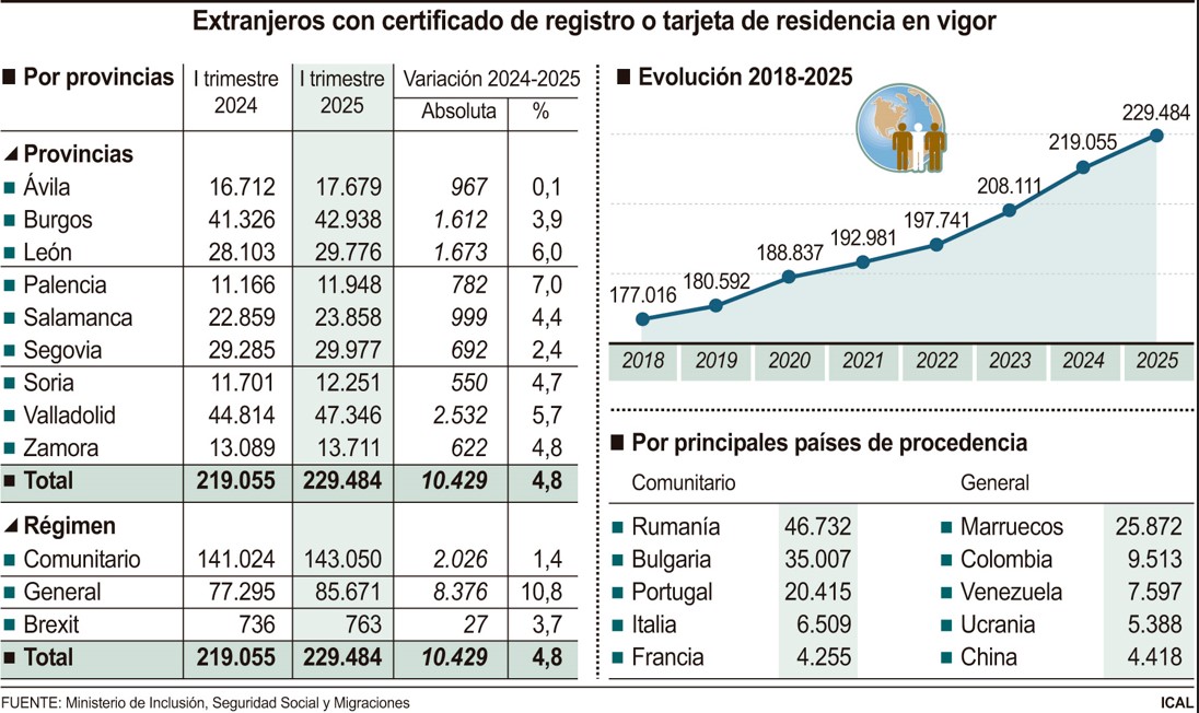 El informe del órgano colegiado adscrito al ministerio que dirige Elma Saiz, precisa en su último informe que a finales de marzo, había en Castilla y León 143.050 extranjeros con certificado de registro (ciudadanos de la UE), un 1,4 por ciento más que en 2024, que representa sumar 2.026 ciudadanos en términos absolutos. Asimismo, los inmigrantes con autorización alcanzaron los 85.671, y crecieron a dos dígitos, un 10,8 por ciento, con 8.376 más. Por último, había 763 con TIE-Acuerdo de Retirada (británicos, tras el brexit), que avanzaron un 3,7 por ciento, aportando 27 individuos a la población autonómica.
