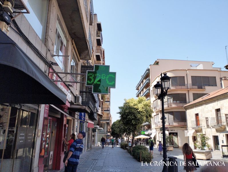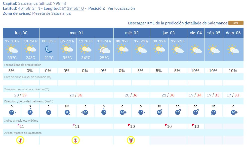 La gran mayoría del territorio de Castilla y León, a excepción de la meseta de León, el este de Burgos y el sur de Salamanca y Ávila, entré este lunes a mediodía en aviso amarillo de la Agencia Estatal de Meteorología (Aemet) por temperaturas que pueden alcanzar los 38 grados en las mesetas de Salamanca, Valladolid y Zamora, el norte de Burgos y el sur de Ávila. La ciudad del Tormes estará en alerta amarilla los tres primeros días de la semana, donde soportaremos, además del sofoco diurno, noches tropicales.