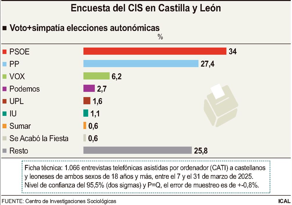 Ical.- Estos datos tienen en cuenta tanto la intención directa de voto a los partidos como la simpatía por unos u otros que el CIS aplica a los indecisos para analizar los posibles resultados de las próximas elecciones autonómicas que, de no convocarse de manera anticipada, se celebrarán en Castilla y León durante el invierno de 2026.
