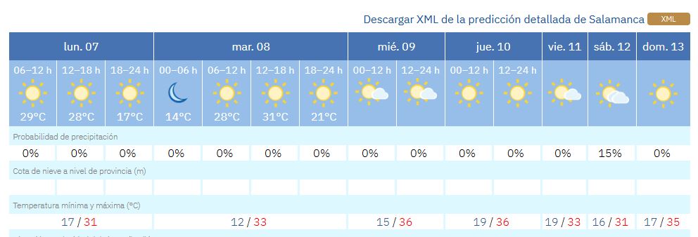 En el resto de la Castilla y León se registrará la temperatura máxima la registrará Zamora que alcanzará los 32º, Ávila 30º y Valladolid con 29º. En Burgos la temperatura máxima se situará en los 23º. Por lo que respecta a la mínima Soria, León y Burgos registrarán 12º, al igual que en Salamanca que este martes tendremos 12º de mínima.