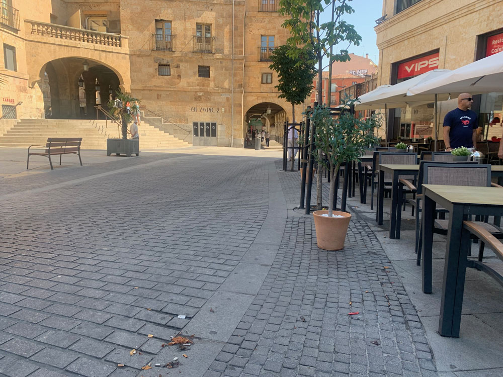 No se trata solo de terrazas desbordadas. Salamanca está siendo colonizada por macetas, jardineras, plataformas, carteles y elementos que obstruyen la vía pública, impidiendo el paso normal de peatones, especialmente de personas mayores, con movilidad reducida, madres y padres con carritos o niños.