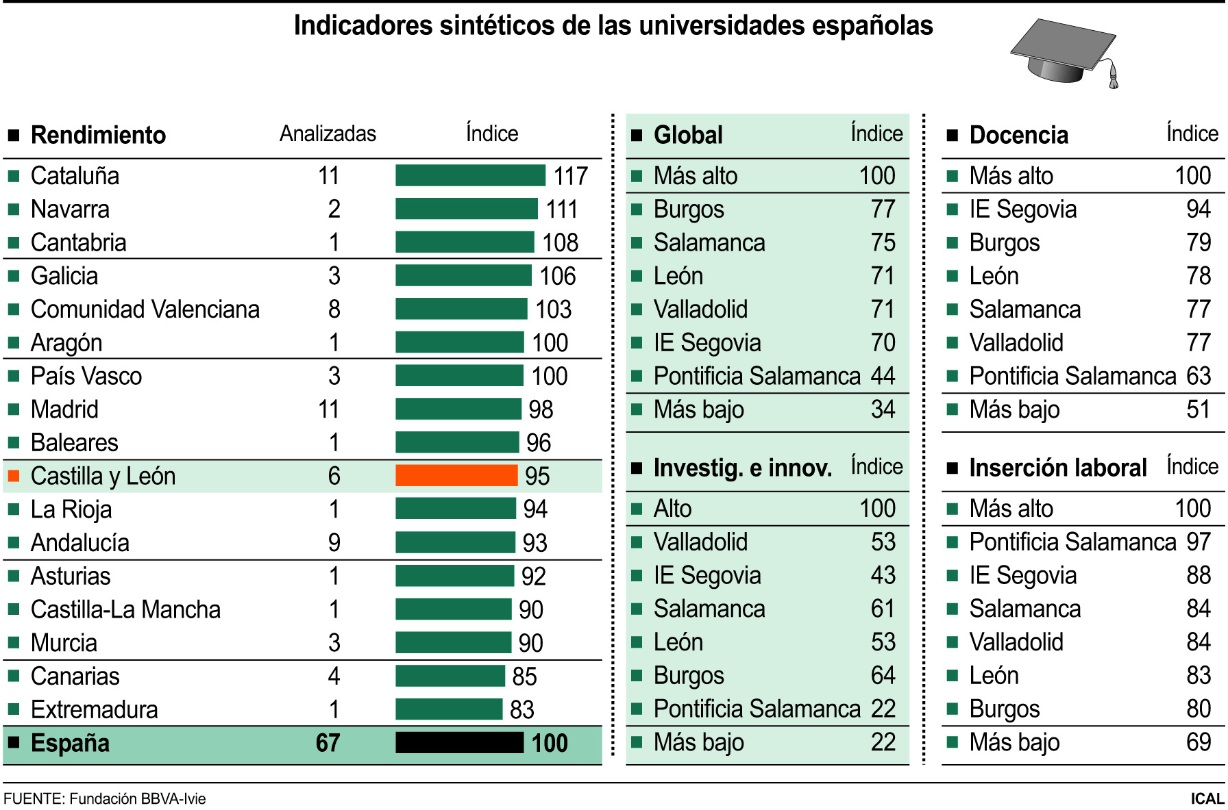 En cuanto al rendimiento docente, la IE Universidad lidera el ranking de Castilla, con un índice de 94. La UBU repite como la primera entre las instituciones públicas, con 79, seguido de León (78), Salamanca y Valladolid (77) y Pontificia de Salamanca (63). Aquí, la privada Universidad de Navarra tiene la mayor puntuación en docencia, con 100.
