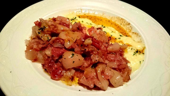 Disponemos en los platos la crema, repartimos para los cuatro comensales las manitas de cerdo deshuesadas y troceadas y rematamos con aceite de oliva, pimentón dulce, sal y una pizca de perejil.