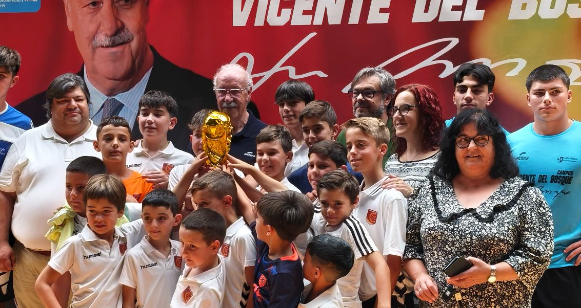 La visita del entrenador salmantino ha supuesto un momento inolvidable para las decenas niños y niñas que participan este año en el campus, quienes han podido compartir experiencias, recibir consejos, hacer preguntas y fotografiarse con una de las figuras más queridas del deporte español y con la réplica del trofeo del Mundial de fútbol.