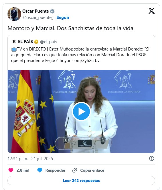 El ministro de Transportes, el socialista Óscar Puente, ha añadido una nota de sarcasmo a la polémica, conectándola con otro de los grandes temas de la semana, el «caso Montoro». En un mensaje en redes sociales, Puente ha ironizado sobre cómo dos figuras tan dispares están marcando la actualidad del PP: «Montoro y Marcial. Dos Sanchistas de toda la vida».