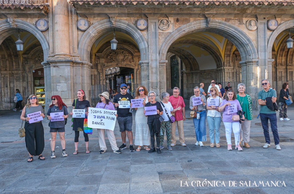 Una veintena de salmantinos se concentraron este jueves en la Plaza Mayor en apoyo a Juana Rivas, que trata de paralizar la entrega de su hijo pequeño a su padre, un italiano al que acusan de maltratarlo. La entrega se producirá este viernes tras fracasar todos los intentos y contactos para trata de impedir que el niño vaya con su progenitor.