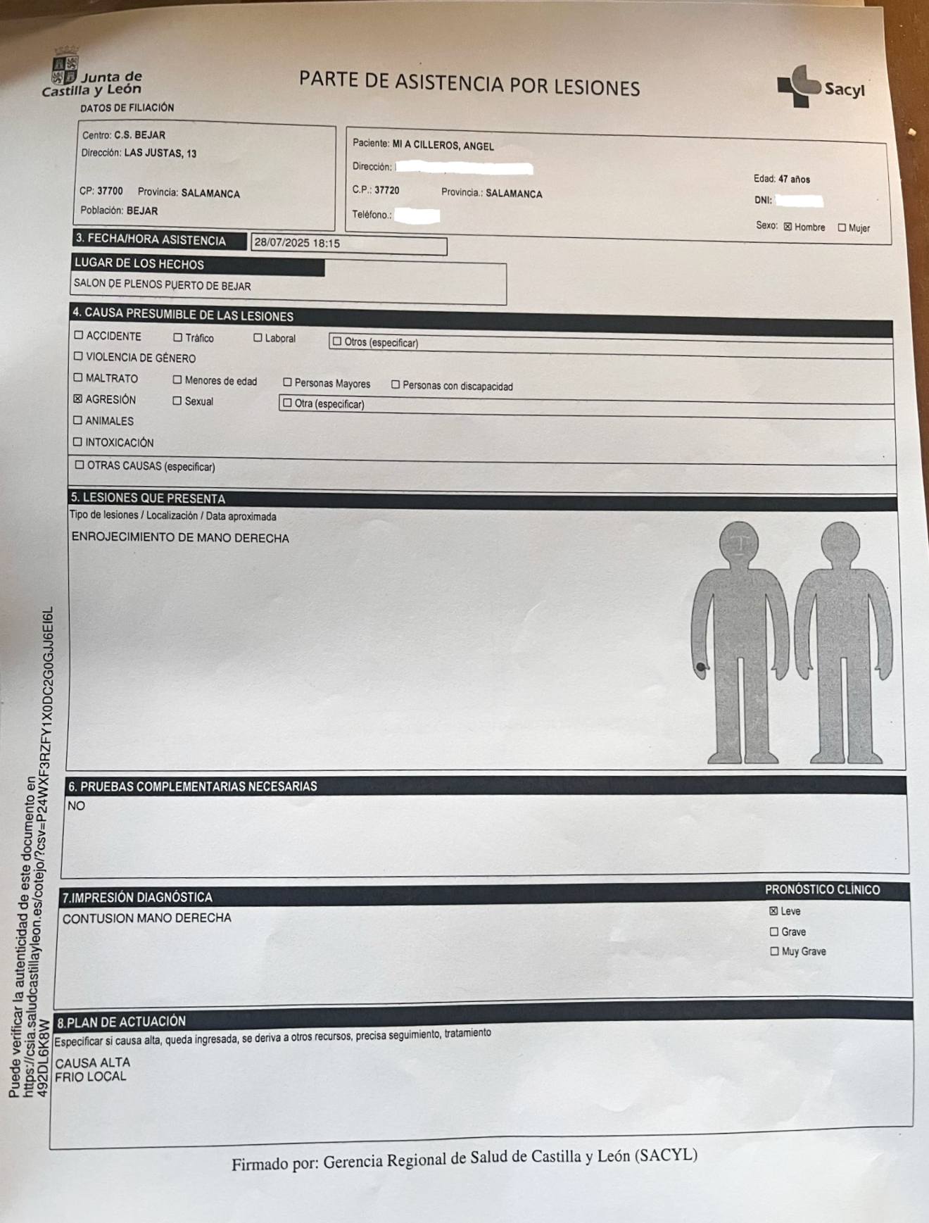 Tras este “lamentable e indignante incidente, el alcalde tuvo que ser atendido en el centro de salud de la localidad”, donde se realizó el parte médico que acompaña el comunicado hecho público, “antes de presentar la oportuna denuncia ante la Guardia Civil”, y que diagnostica al agredido una contusión en la mano derecha.