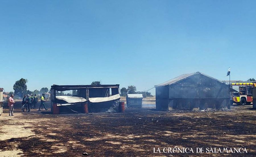 El incendio se produjo en una zona de vegetación segada, avanzó hasta el campamento de las peñas juveniles y afectó a varias casetas colocadas con motivo de las celebraciones de la fiestas patronales en honor de Santa Marta.