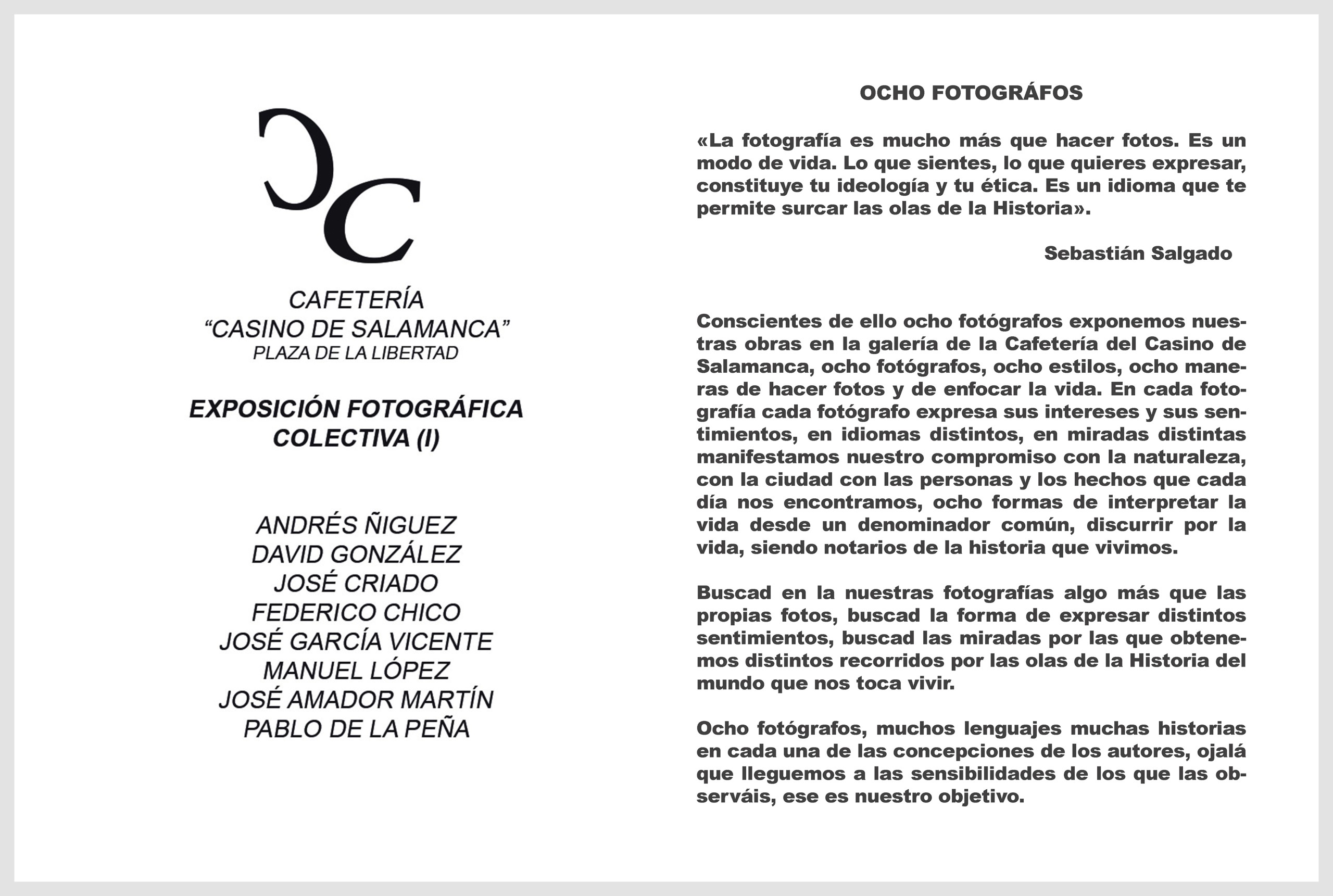 La semana pasada se inauguró en la Cafetería Casino de Salamanca la exposición colectiva Ocho Fotógrafos organizada por José Amador Martín quién participa junto a Andrés Ñiguez, David González, José Criado, Federico Chico, José García Vicente, Manuel López y un servidor. Estará a vuestra disposición hasta después de Ferias y Fiestas, con sus obras impresas en papel, enmarcadas y colgadas en la pared.