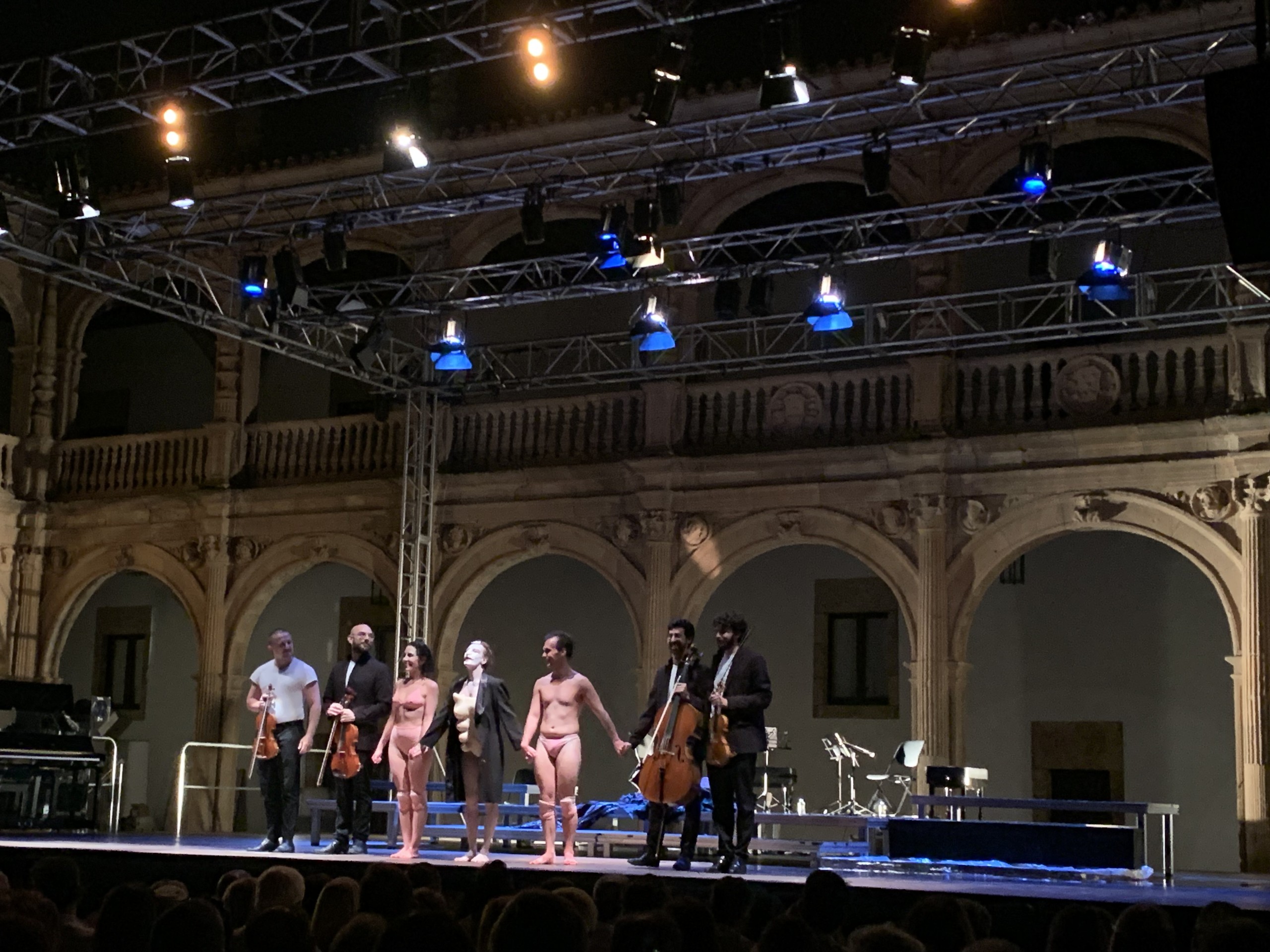 Volvamos a la mitología griega –aunque me resulta difícil desligar que Salamanca vive un infortunio si no apoya las artes en el sentido más amplio de la palabra-. La puesta en escena de esta tragedia no te deja indiferente como espectador, desde el cuarteto de cuerda que comparte protagonismo silencioso –aunque parezca un oxímoron- con Medea, hasta la actriz y el actor que sirven cual apuntadores de la trama y que se marcan unas vidas excesivas y unas muertes sobrecogedoras, donde son creíbles en el papel de hijos, de padre y de esposa. Y, todo ello, salvo raras incursiones, lo expresan con sus cuerpos.