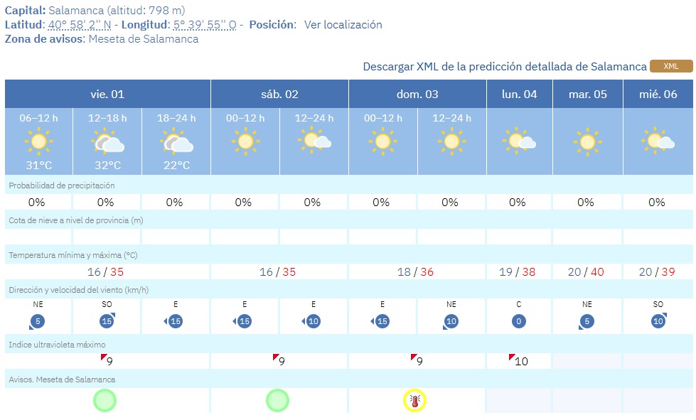 Los termómetros en Salamanca capital subirán: el viernes llegarán a 35 grados, el domingo hasta los 36 (estaremos en aviso amarillo ese día) y martes se espera una máxima de 40º, para descender un grado el miércoles.