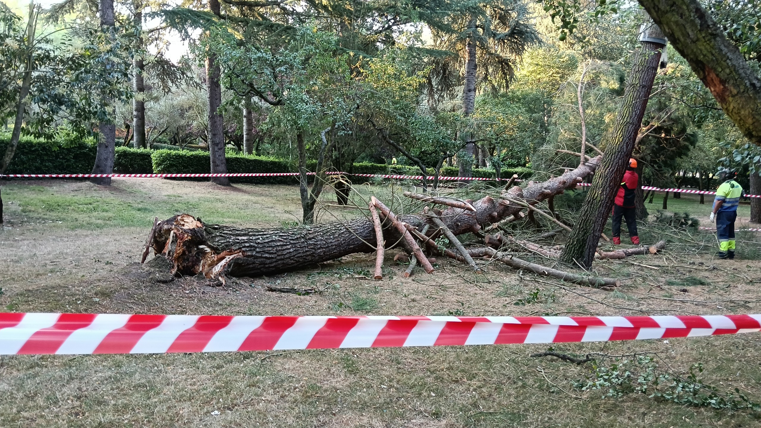 Todo ocurrió a las 19.00 horas, cuando una mujer de 58 años paseaba al perro de una amiga. Sintió un ruido seco y vio como a escasos centímetros de ella y el perro que paseaba se desplomaba un árbol de grandes dimensiones en el parque de los Jesuitas. Todavía tiene el temblor metido en el cuerpo.
