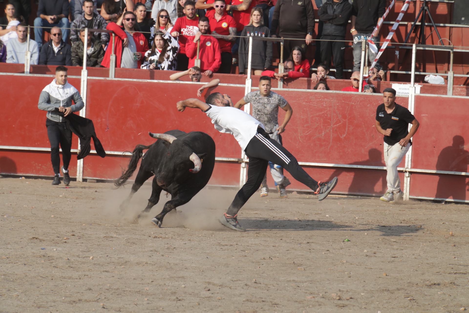 Sustos y risas en el festejo taurino de esta mañana de sábado en Santa Marta. Algún que otro grito cuando varias chicas fueron volteadas por la vaquilla y uno de los mozos al ser alcanzado por el toro.