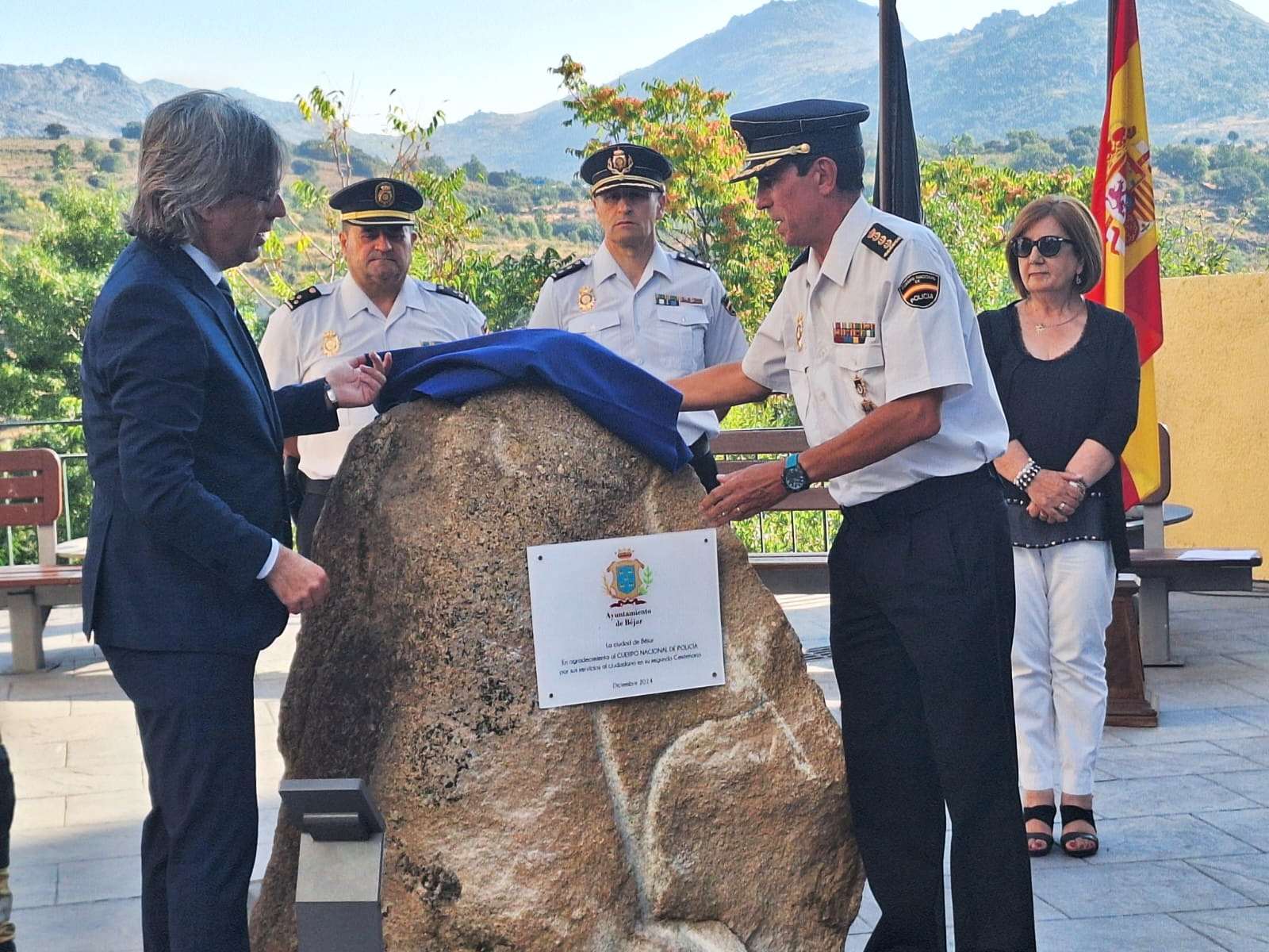 Béjar cuenta con una nueva plaza en su callejero o, al menos, con una zona de la vía pública con nombre recién estrenado. El alcalde de Béjar, Luis Francisco Martín, acompañado por varios miembros de la corporación municipal, ha participado este lunes en su inauguración. Se trata de la Plaza de la Policía Nacional, con la que se busca hacer un homenaje a los 200 años de servicio de este cuerpo de seguridad del Estado. La placa que la nombra se ha situado en la fachada principal de la comisaría de la Policía Nacional.