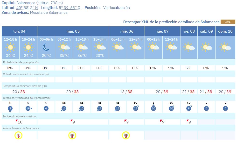 Salamanca está en aviso amarillo por el calor excesivo, al menos, hasta el miércoles, incluido, según las previsiones de la Aemet, que este lunes anunció que la ola de calor en la que estamos inmersos se prolongará, por lo menos, hasta el domingo. En la ciudad del Tormes se esperan máximas de 39º a la sombra y mínimas nocturnas tropicales, es decir, que no bajan de los 20º y complicarán la conciliación del sueño.