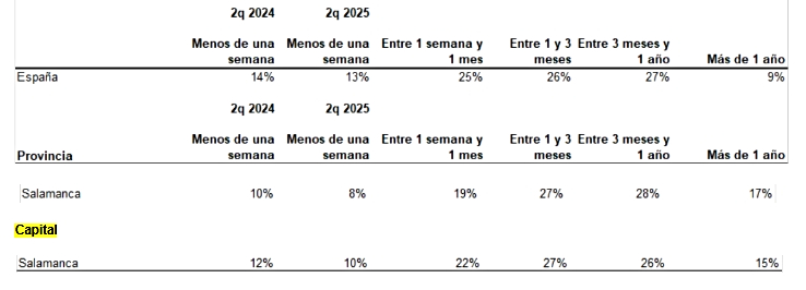 El porcentaje también está un punto por encima del estatal en plazos de venta de tres meses a un año, con un 28% para nuestra provincia (el plazo más habitual en el mercado provincial) y una media española del 27%. Asimismo, un 17% de las viviendas situadas en municipios charros necesitaron más de un año para encontrar compradores (un 9% de media en España).