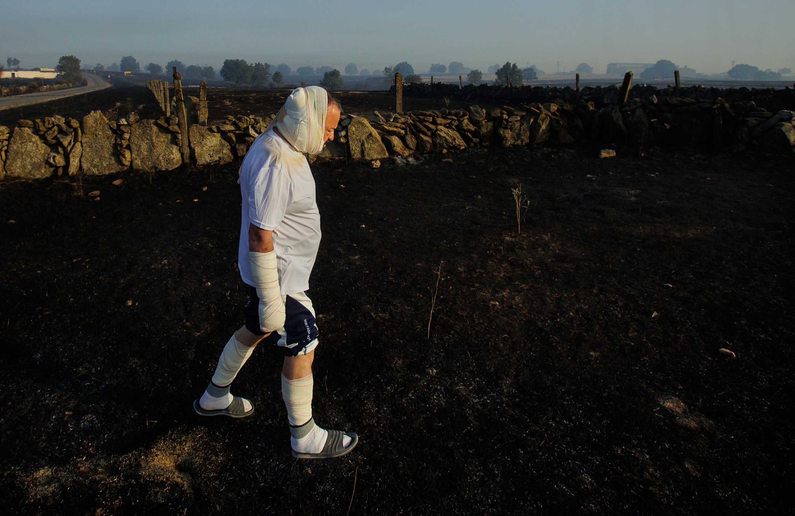 El avance del fuego en la comarca de Vitigudino dejó este viernes en Cipérez una escena límite que José Manuel Blanco, vecino de 60 años, difícilmente olvidará. “El fuego pasó de una finca pastada por las vacas a otra que estaba sin pastar y, cuando saltó al otro lado del camino, ya era imposible controlarlo. Corría más que yo”, cuenta a Ical tras resultar herido con quemaduras en una mano.