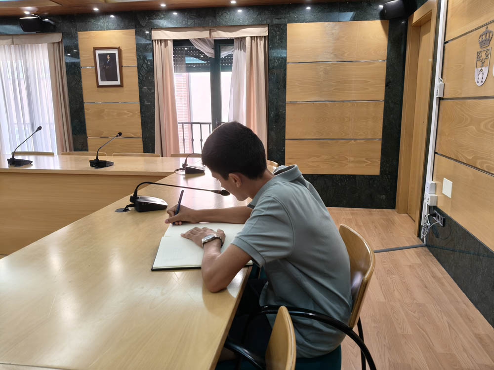 El joven golfista recibió un obsequio institucional entregado por el alcalde, Pedro Samuel Martín, y firmó en el Libro de Honor de Carbajosa donde ha escrito un mensaje en el que ha animado a practicar golf y ha agradecido a Carbajosa, a su club La Valmuza Golf y a sus entrenadores.