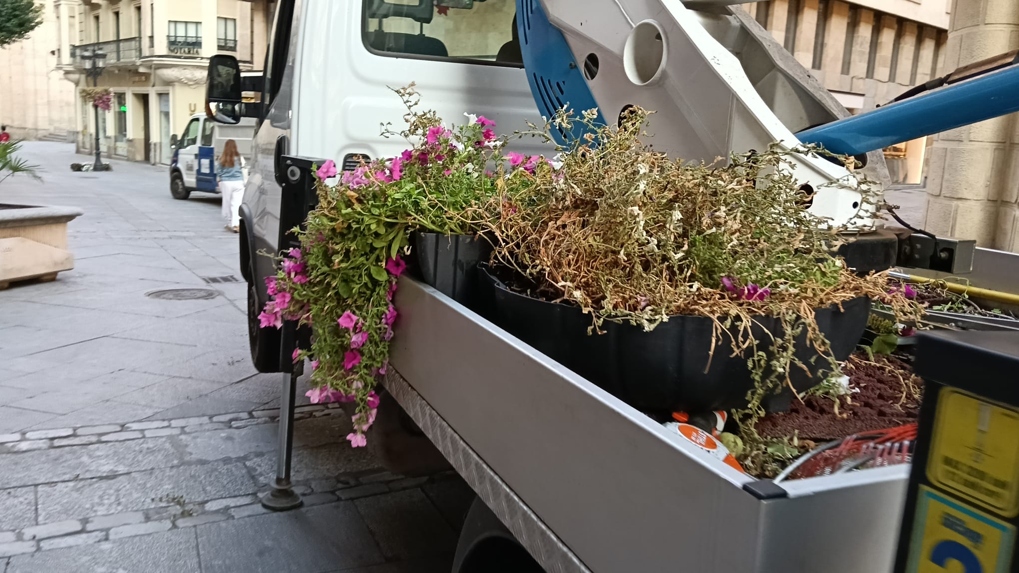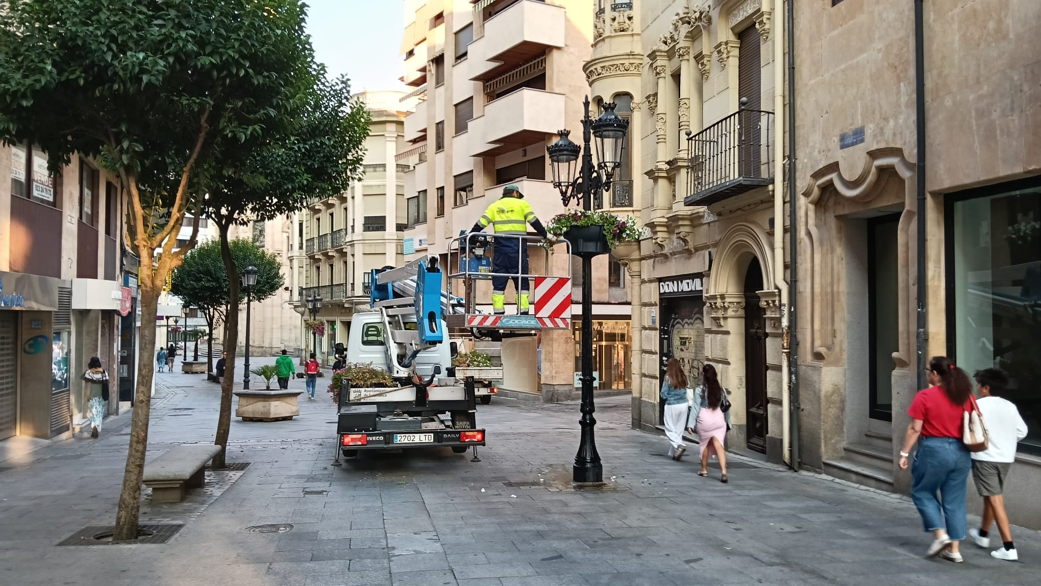 Los operarios de parques y jardines del Ayuntamiento de Salamanca procedieron este jueves a eliminar las macetas secas por otras más lozanas y frescas.