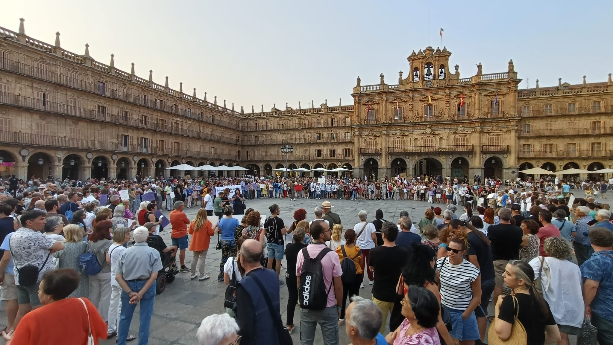 Un gran círculo de personas se congregó en la Plaza Mayor de Salamanca pidiendo la dimisión de Mañueco y Quiñones por la gestión que han hecho desde la Junta de Castilla y León en los incendios de León, Zamora, Salamanca, Ávila o Palencia.