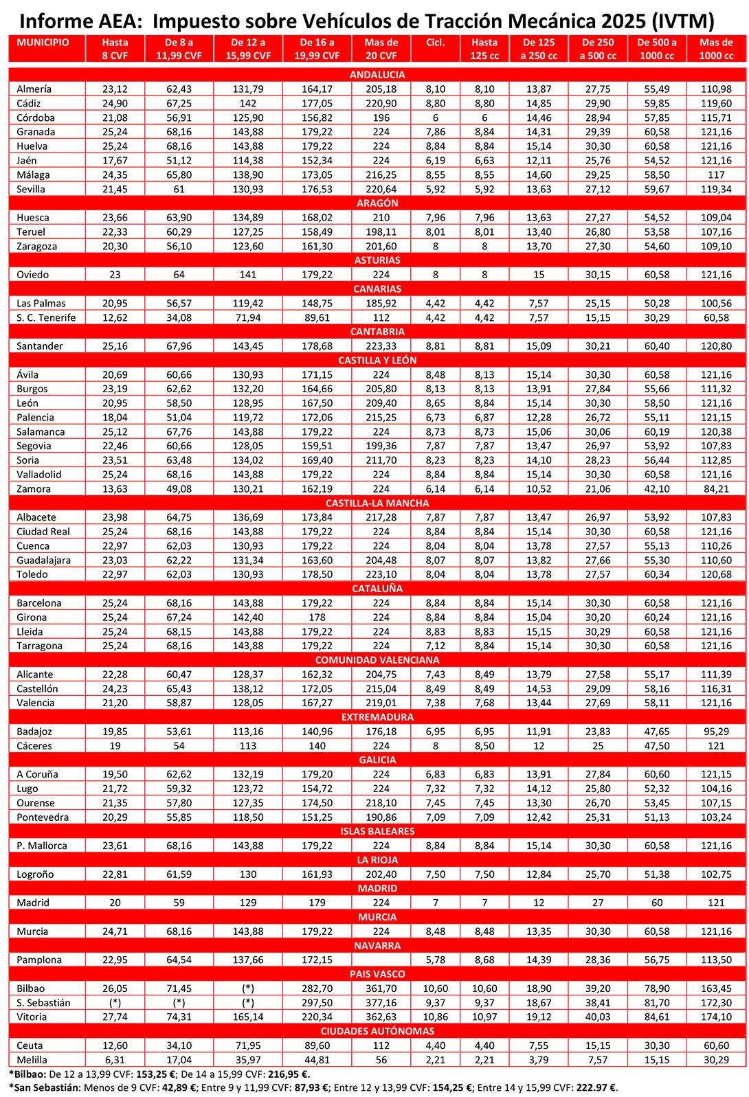 Según un estudio elaborado por Automovilistas Europeos Asociados (AEA), donde se pone de manifiesto las enormes diferencias que existen entre ciudades, mientras este tipo de vehículo paga en Santa Cruz de Tenerife 34,08 euros, en Barcelona 68,16 euros y en Vitoria 74,31 euros. Entre los ayuntamientos más caros, según cita la AEA en su informe, también aparecen Bilbao, y resto de ciudades que aplican el máximo como Gerona, Tarragona, Lleida, Ciudad Real, Salamanca, Valladolid, Huelva, Granada y Palma de Mallorca.