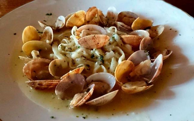 Disponemos en el centro del plato las tiras de tallarines de chipirón y rodeamos con almejas y salseamos con el jugo.