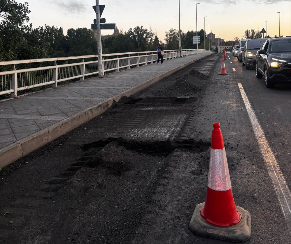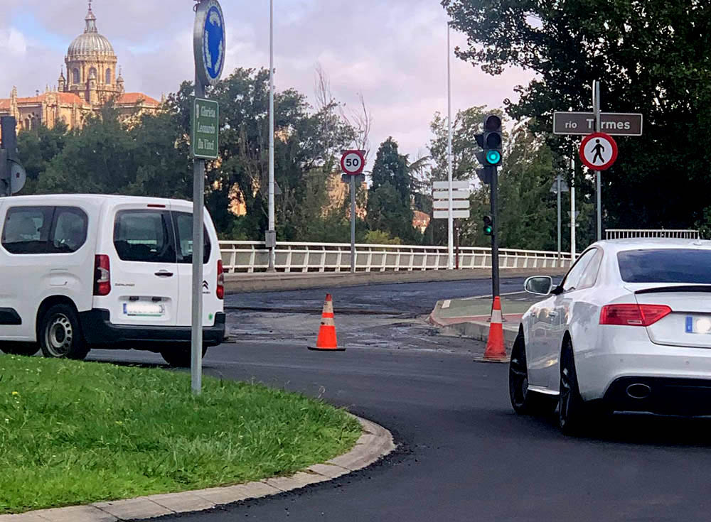 Los salmantinos al volante que vienen de Santa Marta, Carbajosa o por la zona de Alba de Tormes, Peñaranda o Ávila o Madrid llevan varios días comprobando que la entrada a Salamanca no es tan fluida como la semana pasado, tanto a primera hora del día como a última de la tarde. No es que se haya adelantado la vuelta al colegio, es que están asfaltando el puente Felipe VI.