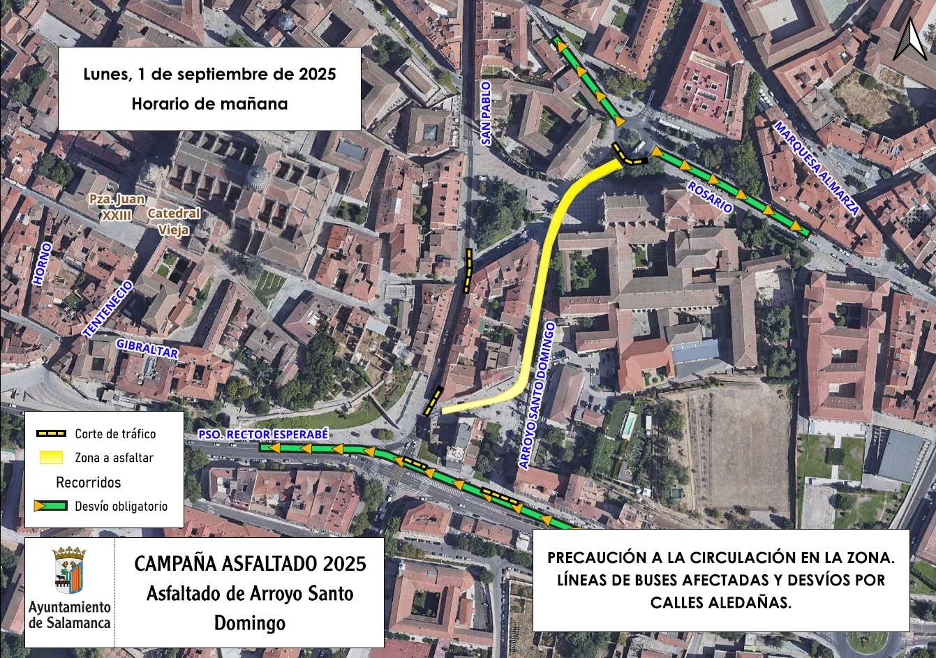 Como consecuencia de estas mejoras, el próximo lunes, 1 de septiembre, se producirá el corte total de Arroyo de Santo Domingo en horario de mañana para proceder al asfaltado de la vía. Las líneas de autobús 1, 3, 4, 8 y 9 cambiarán su recorrido temporalmente para circular a través del paseo de Canalejas, Cuesta de Sancti Spíritus y Gran Vía, para retomar sus recorridos habituales.