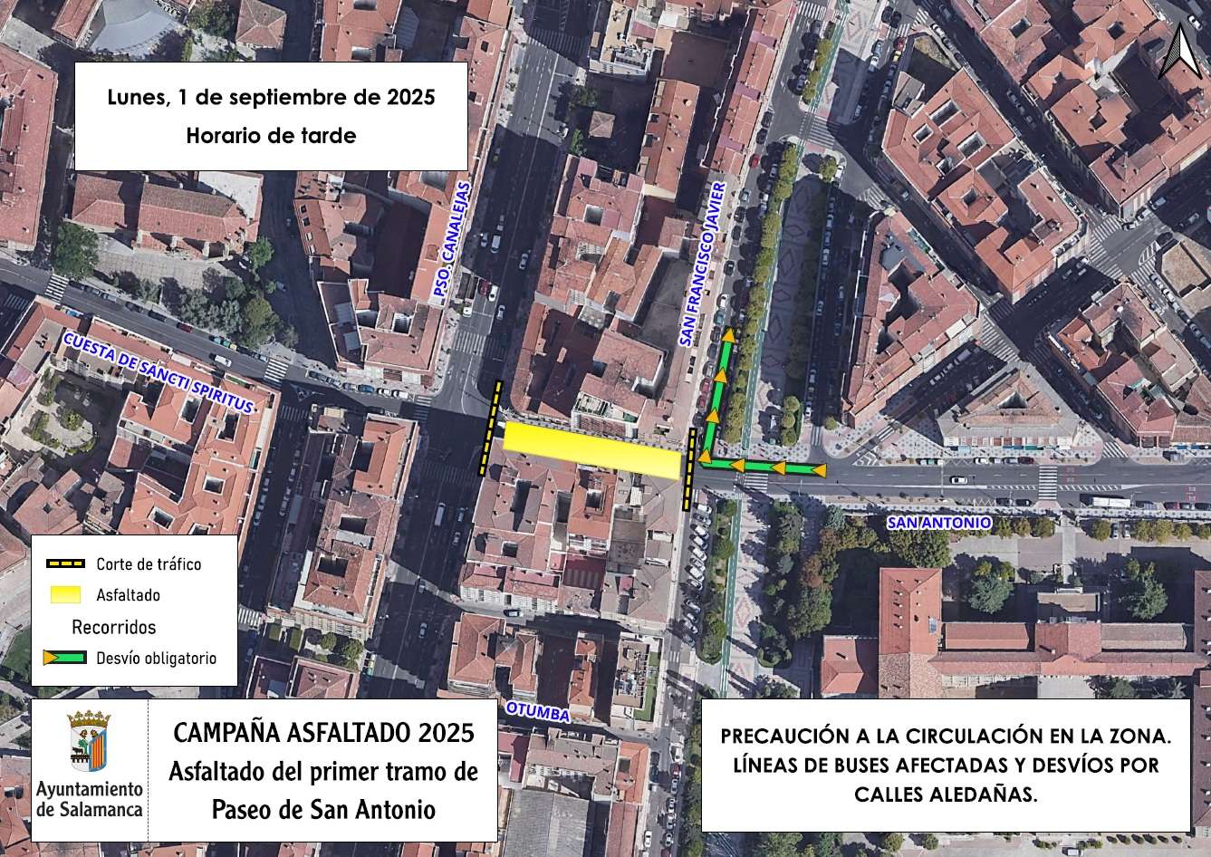 Por la tarde, el corte tendrá lugar en el paseo de San Antonio, entre el paseo de Canalejas y la calle San Francisco Javier, por donde se desviará la circulación para continuar por la calle Padilla hacia Canalejas, de modo que afectará de forma intermitente a las líneas 4, 8 y 12 del bus urbano. Los trabajos de asfaltado se llevarán de forma alterna en cada sentido de circulación del paseo de San Antonio para reducir las molestias en la circulación de vehículos.