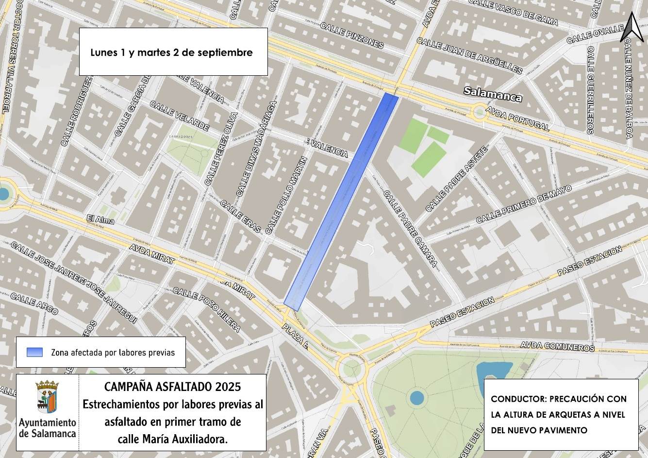 Y hasta el martes 2 de septiembre continuarán los estrechamientos de calzada en la calle María Auxiliadora, entre las avenidas de Portugal y Mirat, debido al levantamiento de tapas y fresado previo a los trabajos de asfaltado.