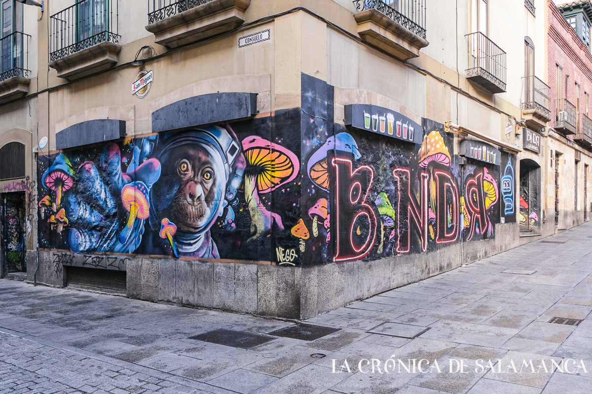 Y para el final, haciendo esquina con Varillas y Consuelo surge un mono espacial que te lleva dónde tu imaginación quiera. Pura distopía. Es la decoración de BNDR Salamanca. Este local puede contar muchas historias, porque durante muchos años fue La Bastilla, sede oficial de los punkis salmantinos.