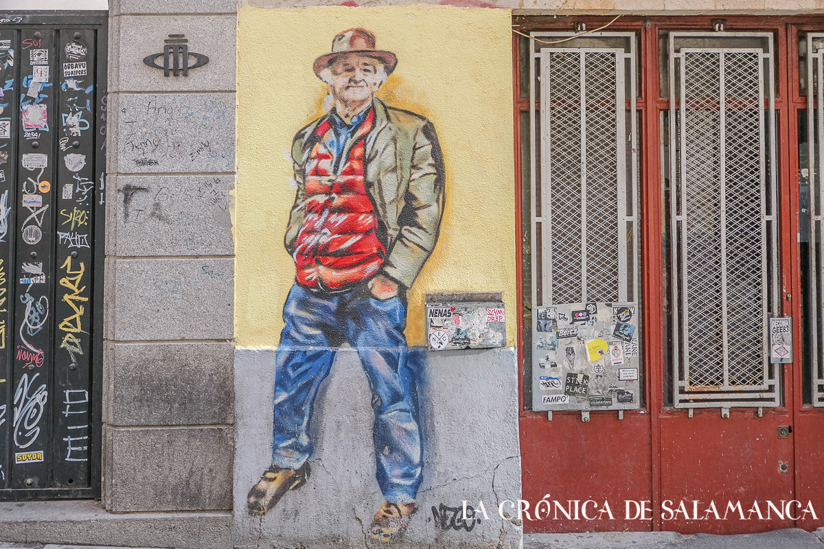 Nego firma el retrato de Miguel Herrero, conocido por todos como Miguel el del Pani, luciendo su característico sombrero de cuero y su chaleco. El homenaje, como no podía ser de otra manera, está en la puerta del Paniagua -uno de los bares que sobrevive de la década de los ochenta-.